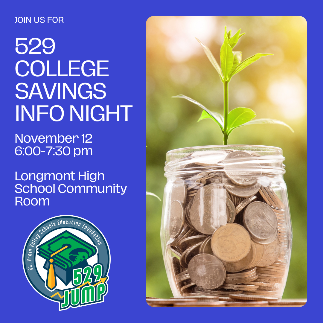 Dreaming about your child’s future career, college, or trade school? It’s never too early to start planning for their success. Join the St. Vrain Valley Schools Education Foundation for a College Savings Information Night on Wednesday, November 12, 2025, from 6:00–7:30 p.m. at the Longmont High School Community Room.